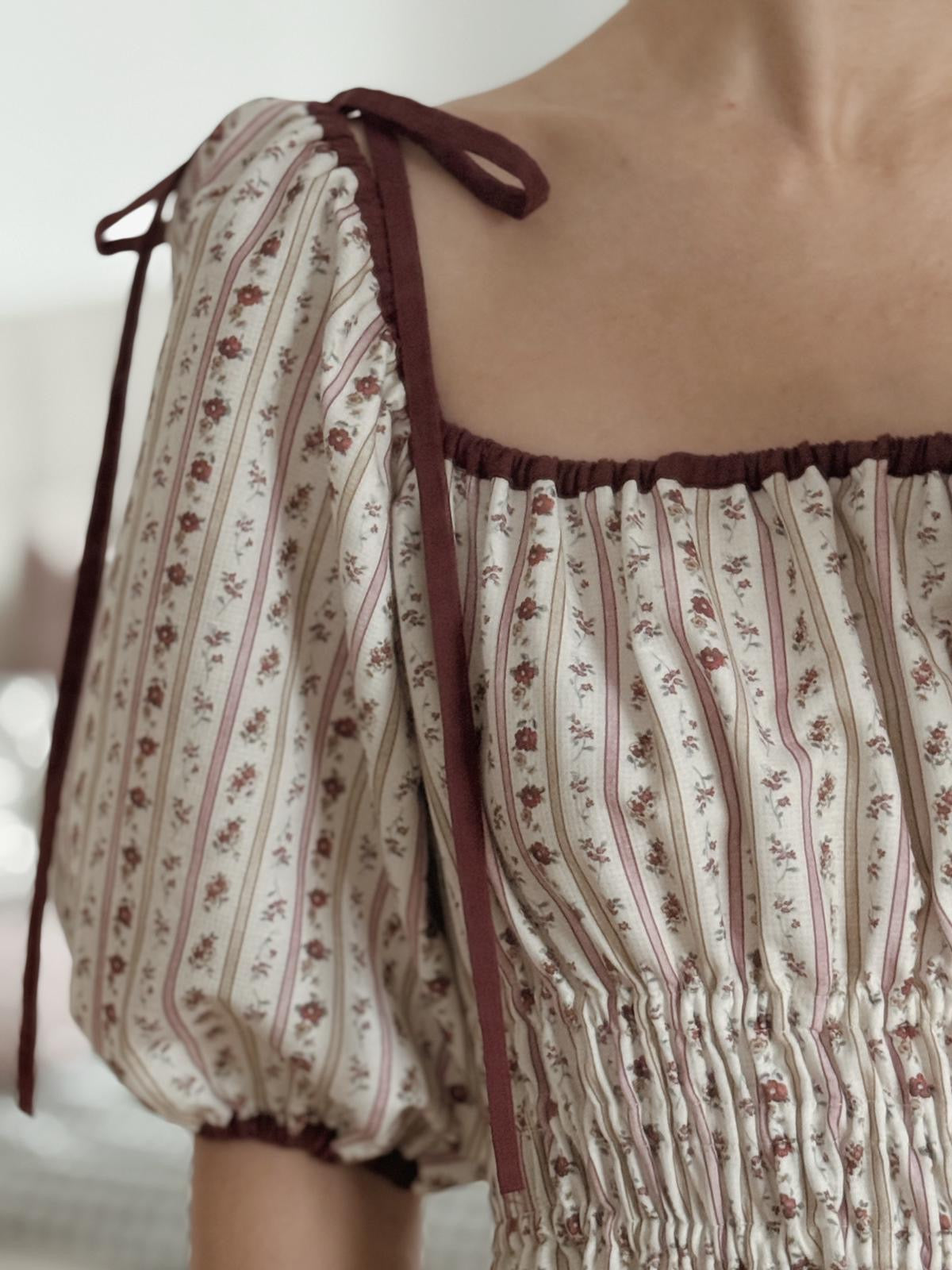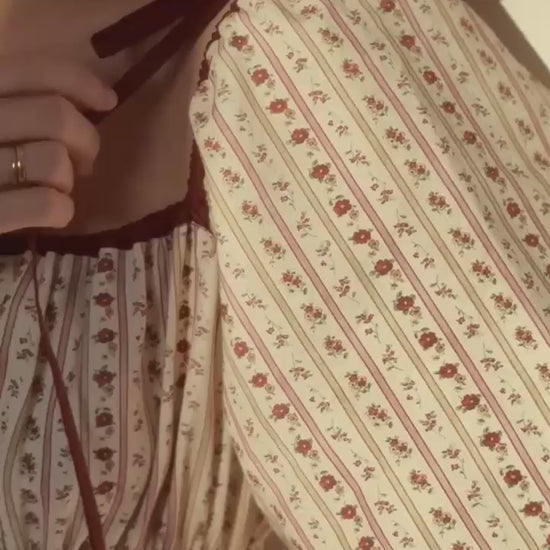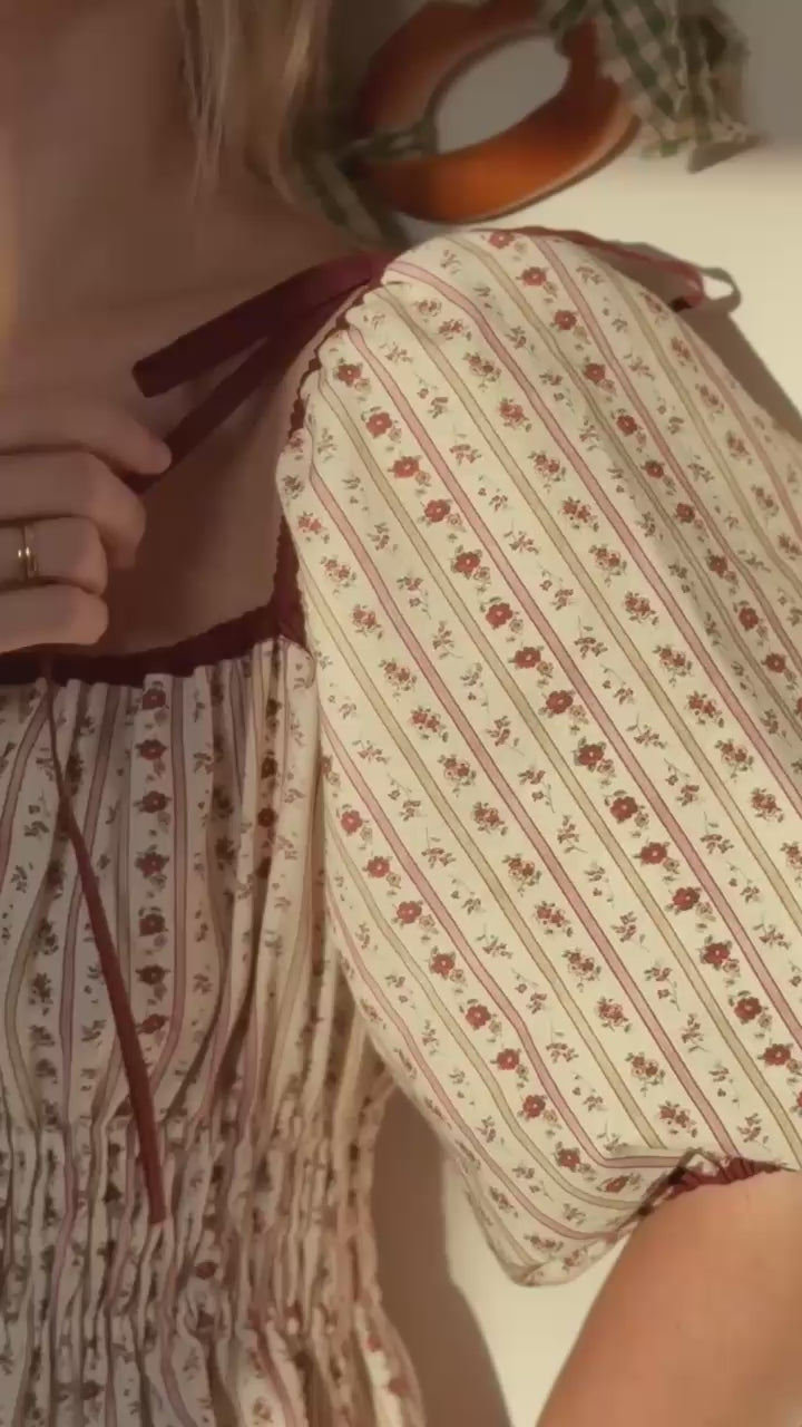 Its floral pattern and beautiful color combination make it a work of art on its own. Delicate dark-red fabric ribbons on each shoulder add a charming, built-in accessory to the dress.