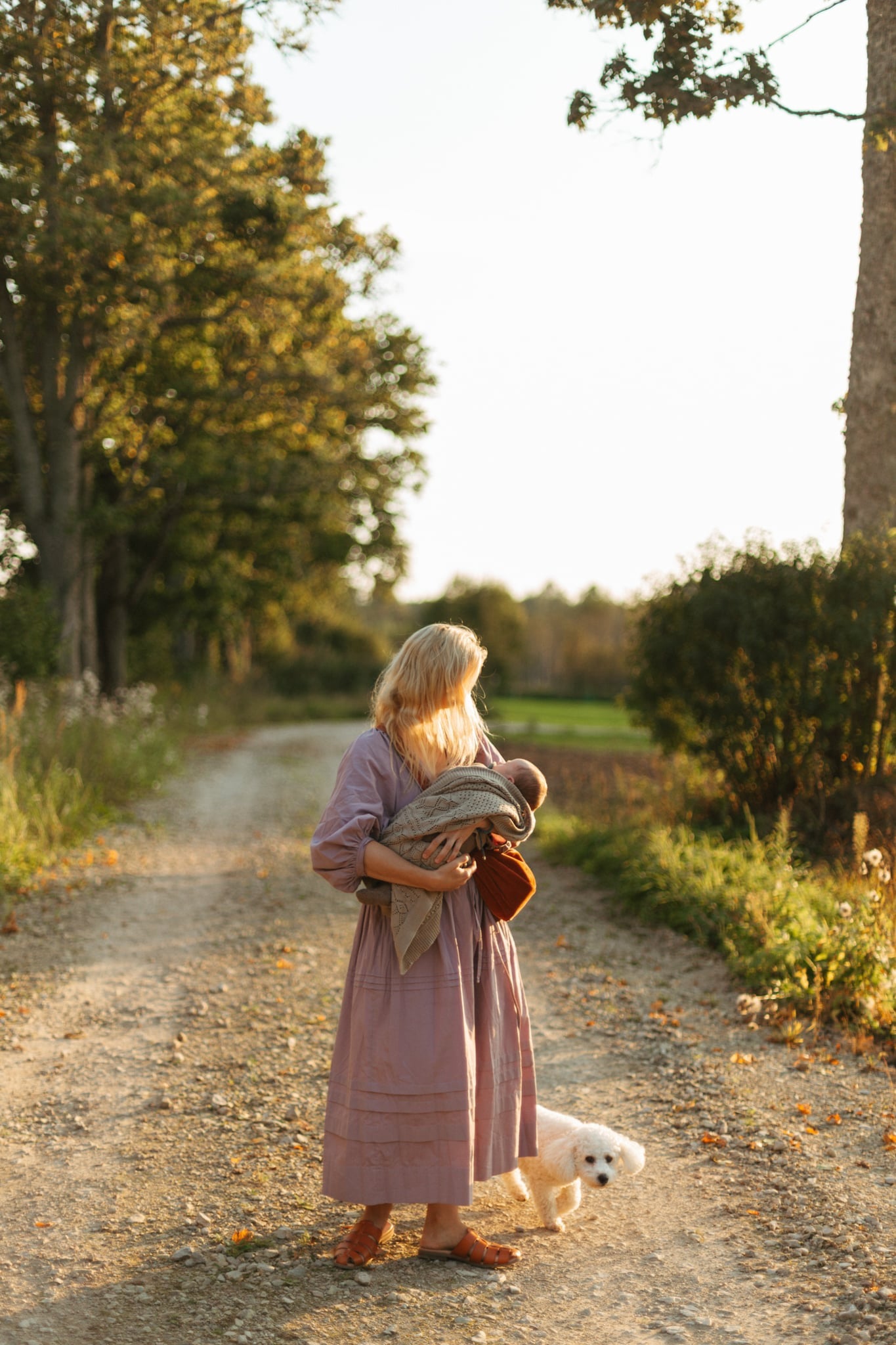 The DAYDREAM dress is crafted from 100% cotton.The dress is a dusty plum color. Featuring a relaxed silhouette with a flattering wrap-style neckline, gathered waist with adjustable ties, and gently puffed sleeves, it offers both style and ease for everyday wear. This dress is beautifully crafted and truly a work of art.