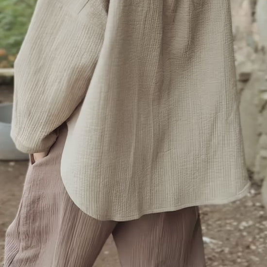 Made from 100% cotton. With a relaxed, slightly tapered fit and a soft, textured feel, they’re perfect for slow mornings, countryside walks, or relaxed city days. Simple, versatile, and naturally elegant — a true everyday essential. These pants come with pockets to make your everyday life more practical.