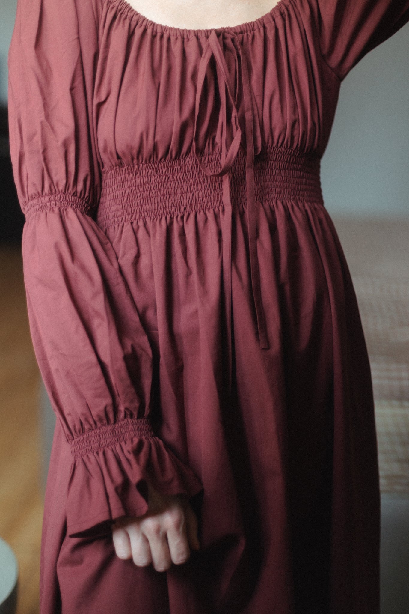 The Sunrise Dress features a softly smocked bodice that shapes gently to your form, along with full, gathered sleeves. The skirt drapes gracefully, moving with you in a way that feels both poetic and grounded.